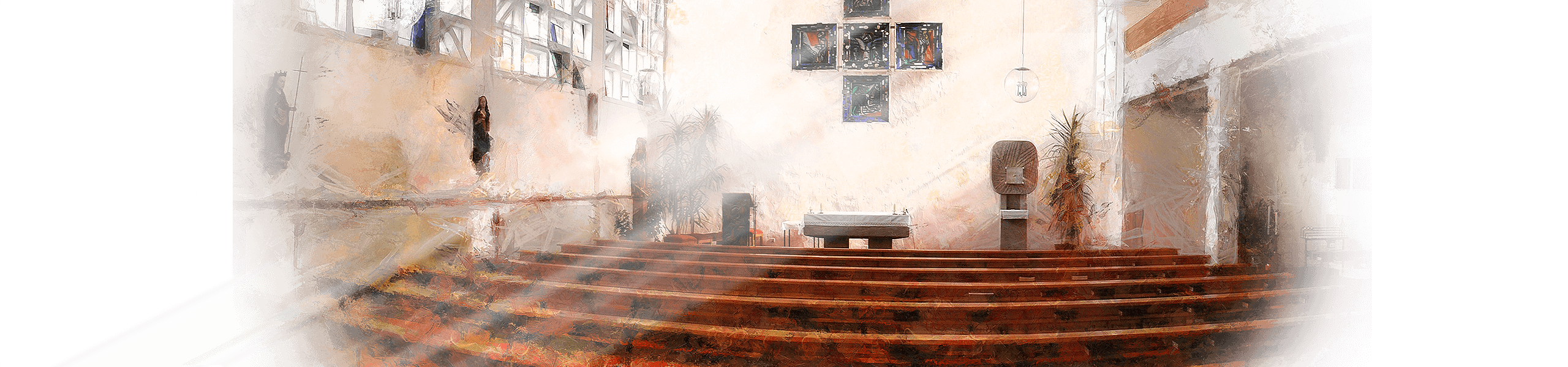 Unteres BildDer barmherzige Samariter – unser Auftrag (Bild unten). Wenn wir die gelbe Farbe, die in den Worten des Heils golden aufleuchtet, mit der blauen Farbe mischen, so entsteht das Grün. Die Vergangenheit (die gelbe Farbe) kreuzt sich mit der Zukunft (aller blauen Farbe) in der Gegenwart, im hoffnungsvollen Grün. Im unteren Bild steht der Esel ganz im Grün. Von ihm ist der barmherzige Samariter herabgestiegen, um sich dem Bruder zuzuwenden, der hilflos am Boden liegt. Unser Tun ist ein Ausfließen aus der Gnade unserer Erlösung. In der Gegenwart ist uns der Herr so nahe, wie wir uns selbst gar nicht nahe kommen können. Im Hebräischen heißt der Esel soviel wie unser Knochengerüst, mit dem wir unterwegs sind. Übertragen heißt das: der Esel ist unser Selbst. Hat er nicht den Herrn nach Jerusalem, in die Stadt des Friedens, geführt? Der Esel ist uns, unser Selbst trägt die Botschaft, wie es im Lied (Thurmair) heißt: „Nur im Leibe können wir Gott anschauen.“ Indem der Samariter, von dem keiner eine gute Tat erwartet hätte, sich dem Leid des Nächsten zuwendet, wird er selbst ein Teil vom Baum des Lebens.